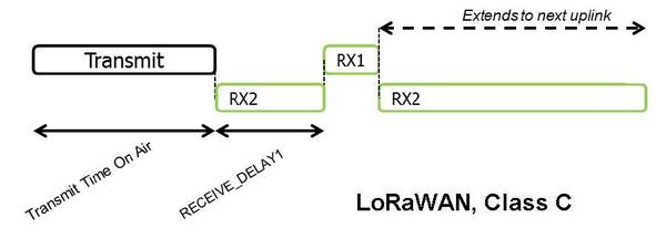 Class C devices are in receive mode almost all the time except when they are transmitting messages. With the exception of the RX1 time window, the end-device uses the RX2 receive parameters.