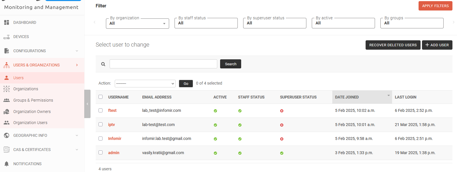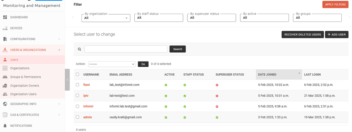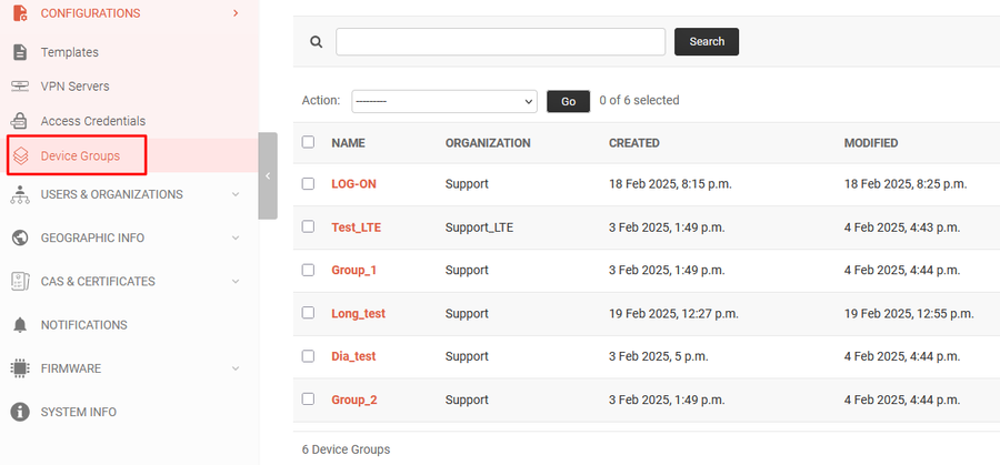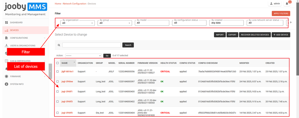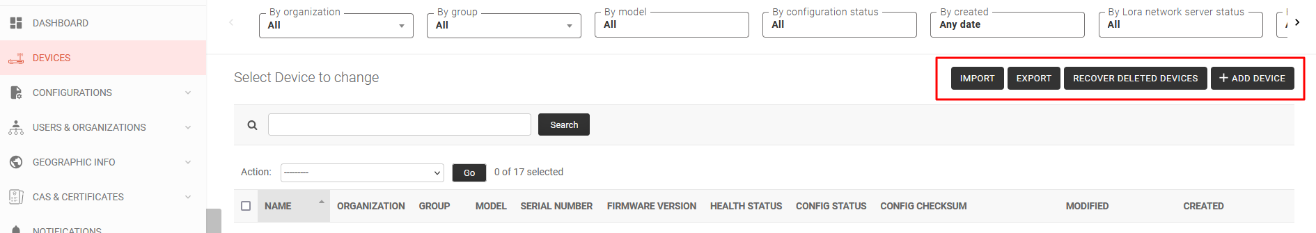 - Filter (by organization, by group, by model, by configuration status, by date created, by loRaWAN network server status, by mode, by geo position)