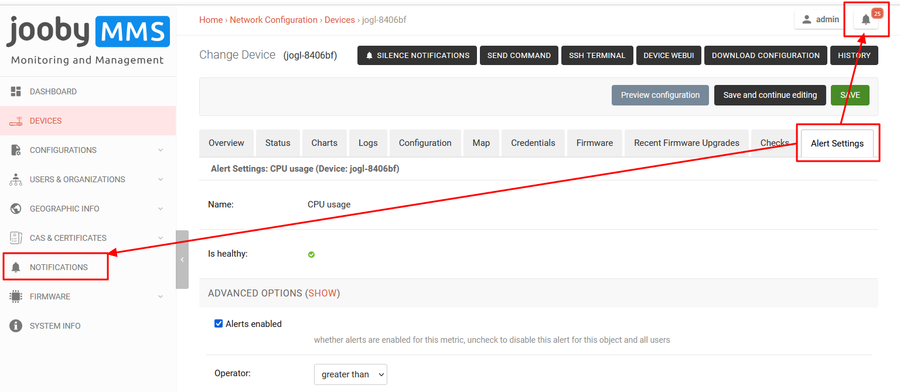 - the state of the metrics that the device gives (CPU, RAM status, Storage, Interface status, Neighbors)