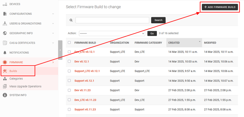- Use tab Builds for add new or edit existing firmware build