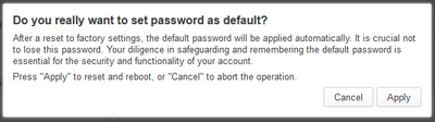 Warning! “Use as default” - Sets a new “default password” and rewrite manufacturer password. Use it carefully. Pay attention on the warning in the pop-up window. Cannot be reset to manufacturer default via “Factory reset”.