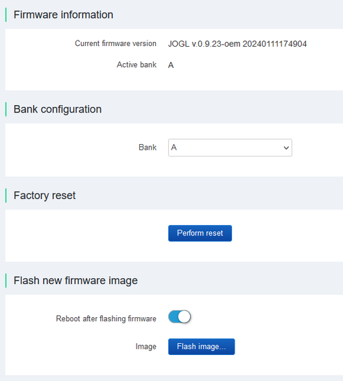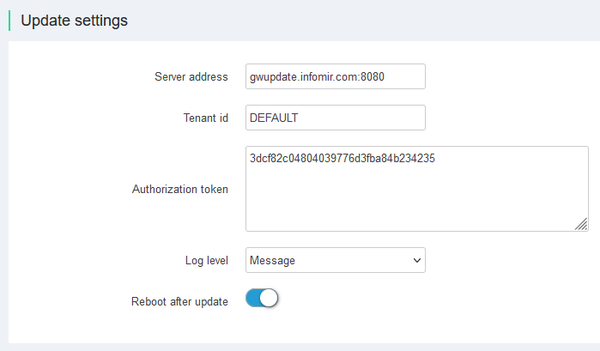 By default, software updates are configured on the equipment manufacturer's servers - gwupdate.infomir.com. It is possible to configure and use your own update servers based on the Eclipse hawkBit™ solution.