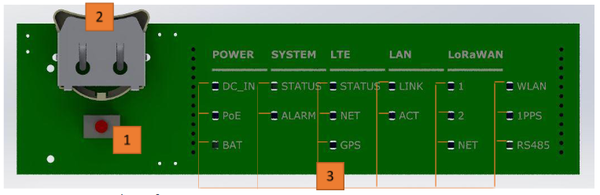 | BAT | Charging status of Backup Battery | Charging in progress – red, Fully charged - green |