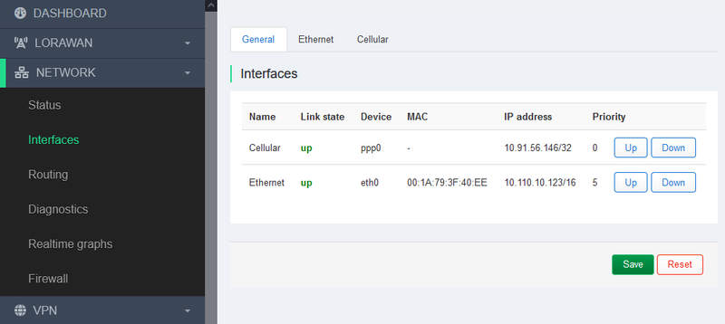 In case of using several connections (Ethernet + LTE), it is possible to select the interface through which LoRa packets will be sent. Interface number “0” (first in the list) is considered as priority. Use the UP/DOWN buttons to raise/lower priority. Use “Save” to apply the changes.