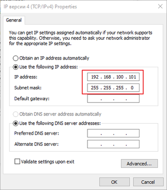 - Configure static IP address for the LAN interface of your PC. For example: 192.168.100.101/24
